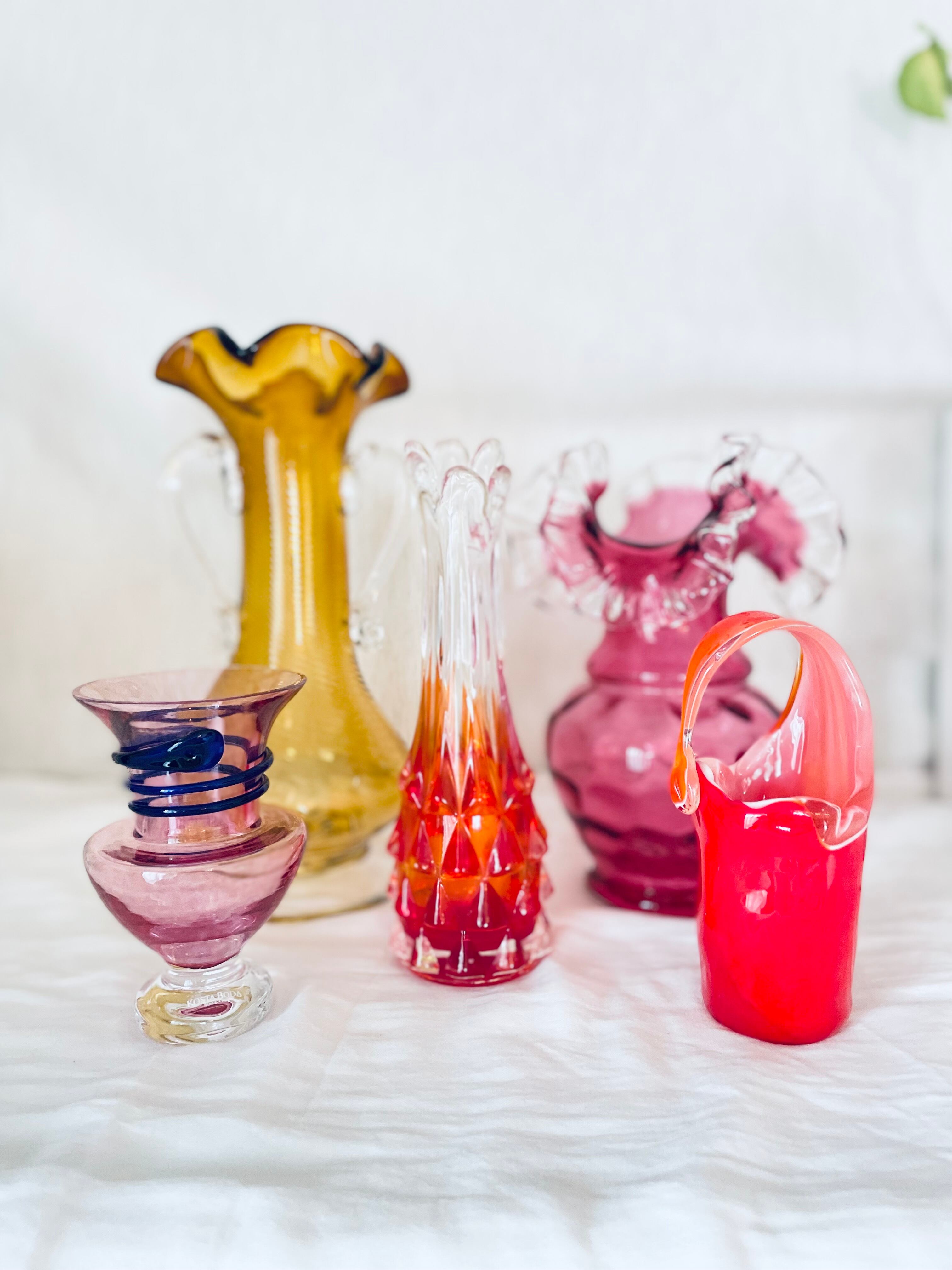 ピンク寄りのパープルカラーに、紺色のデザインがおしゃれなヴィンテージのフラワーベースです。近くでよく見ると、細かなマーブル模様になっていてとても美しい一品です。