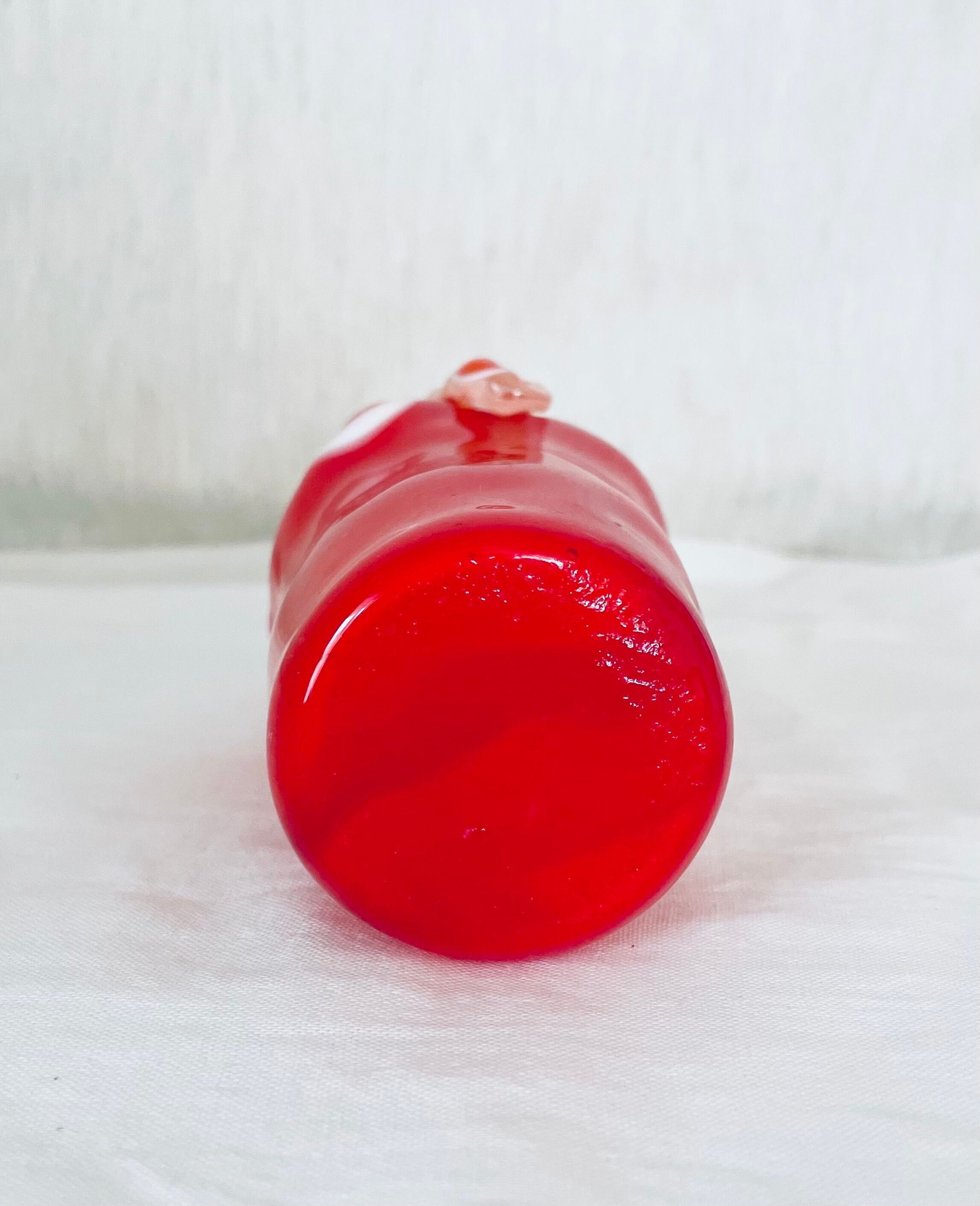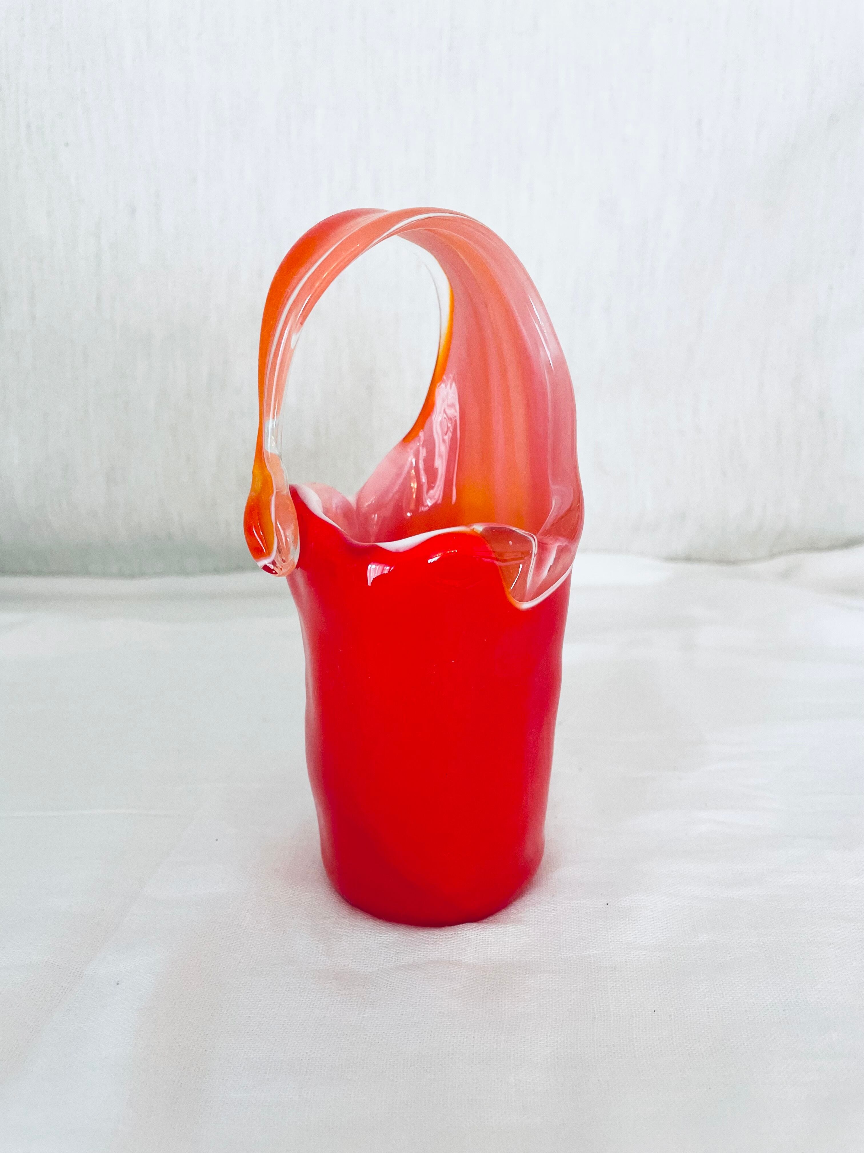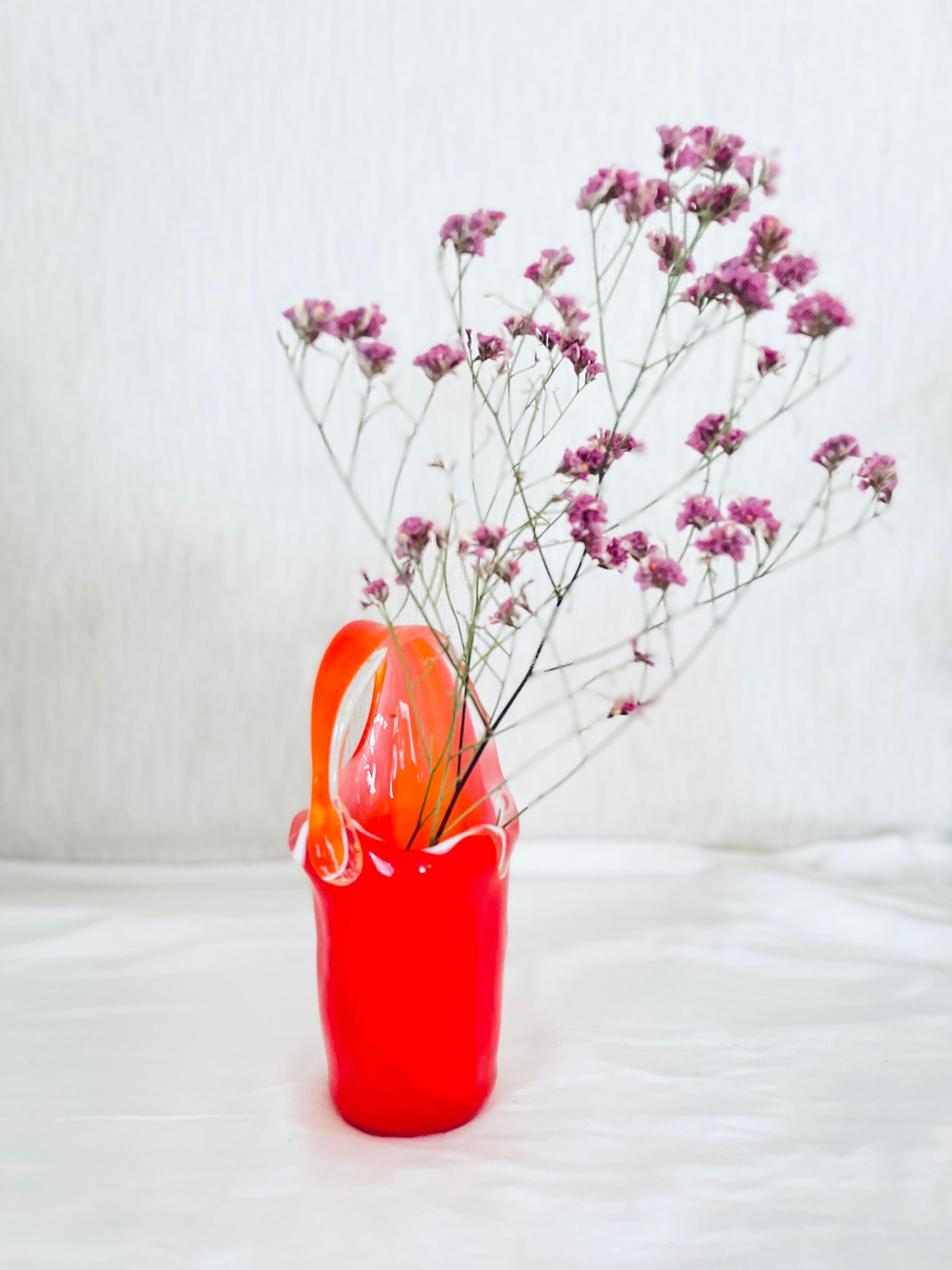 赤オレンジ色(赤よりです)をベースにに持ち手部分に白のカラーがさりげなく入ったヴィンテージのフラワーベースです。