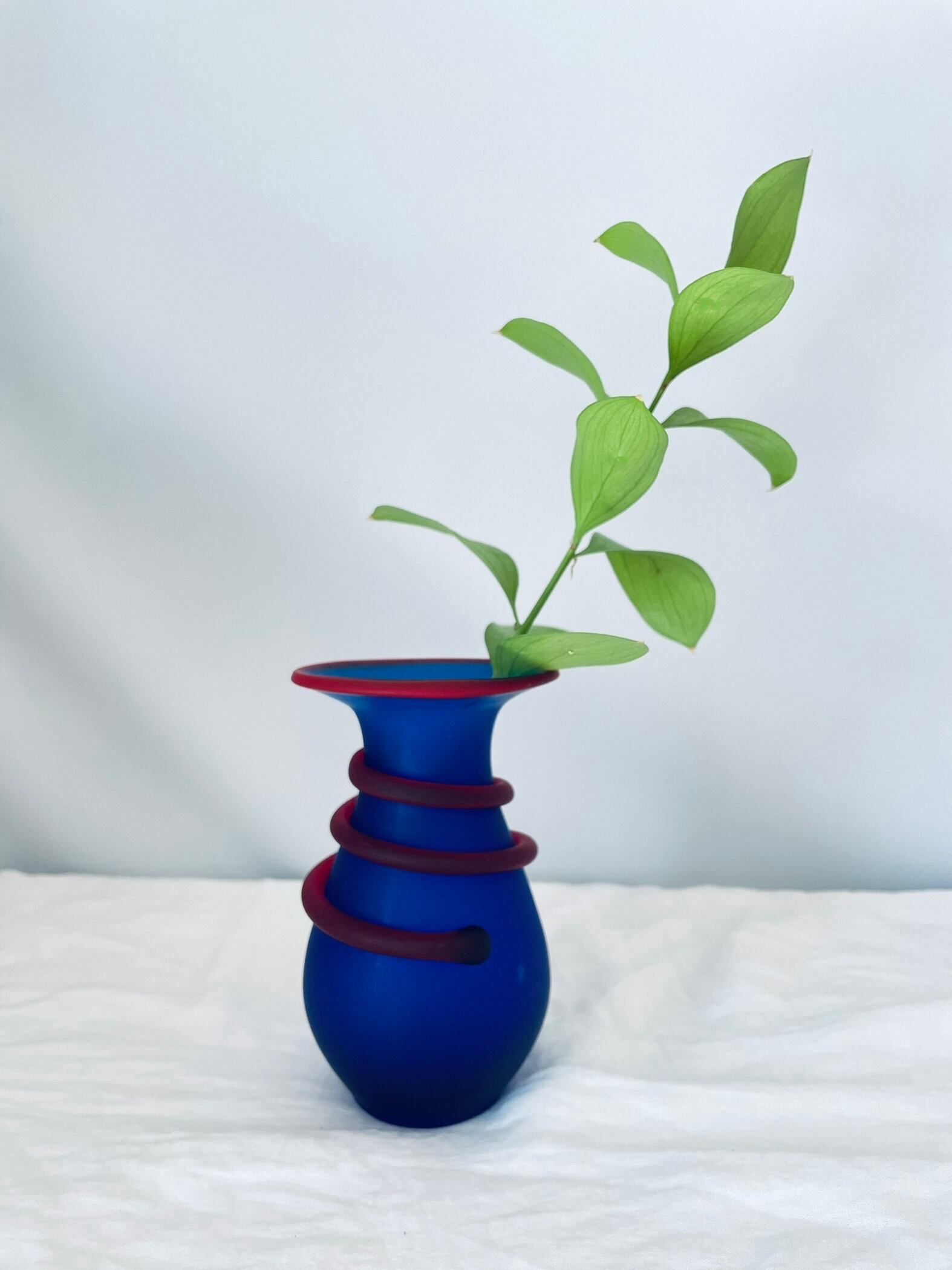 マットな質感のブルーベース(紺色よりです)に赤のラインがおしゃれなヴィンテージのフラワーベースです。製作時についたと見られる気泡があります。(写真5)