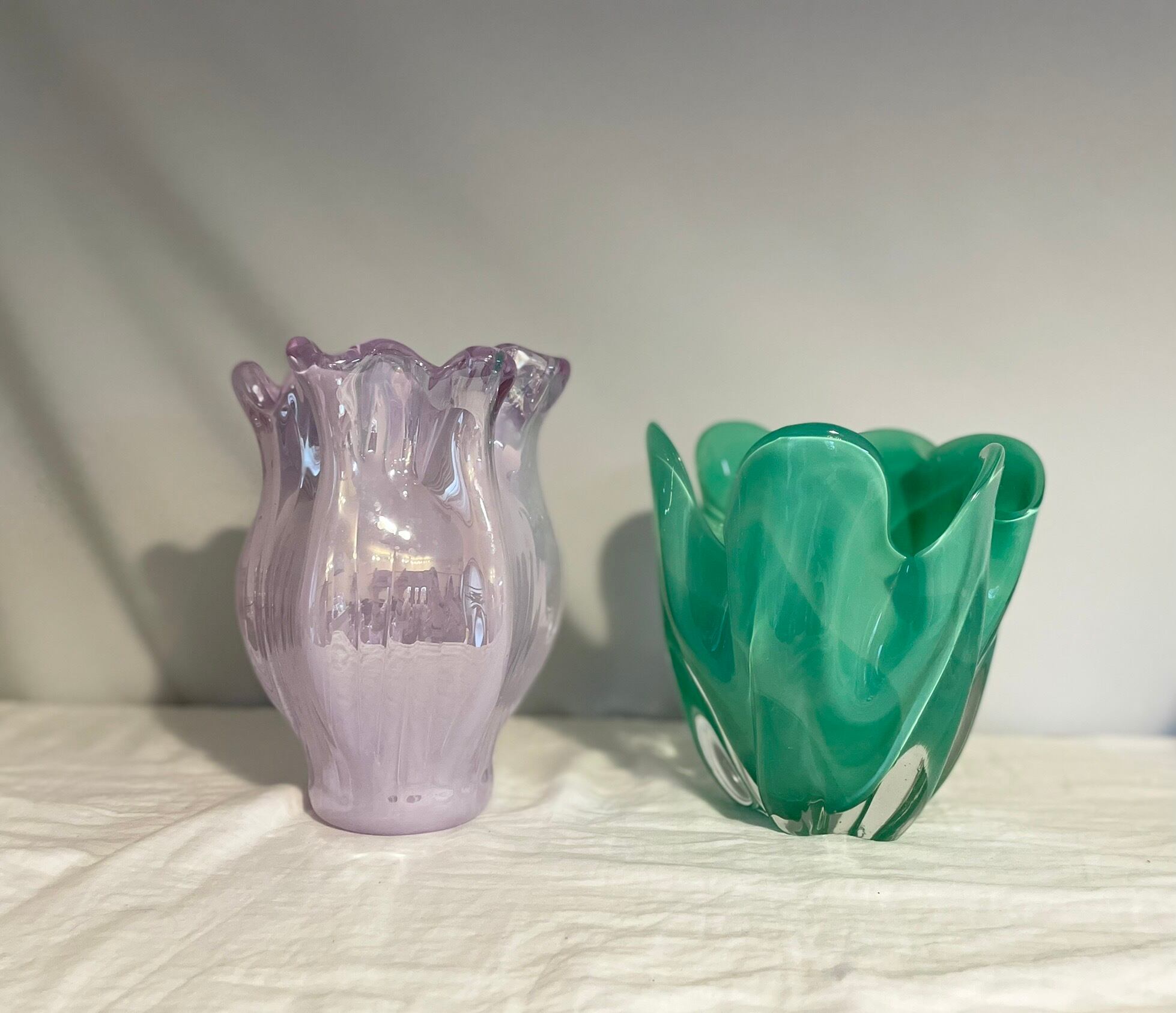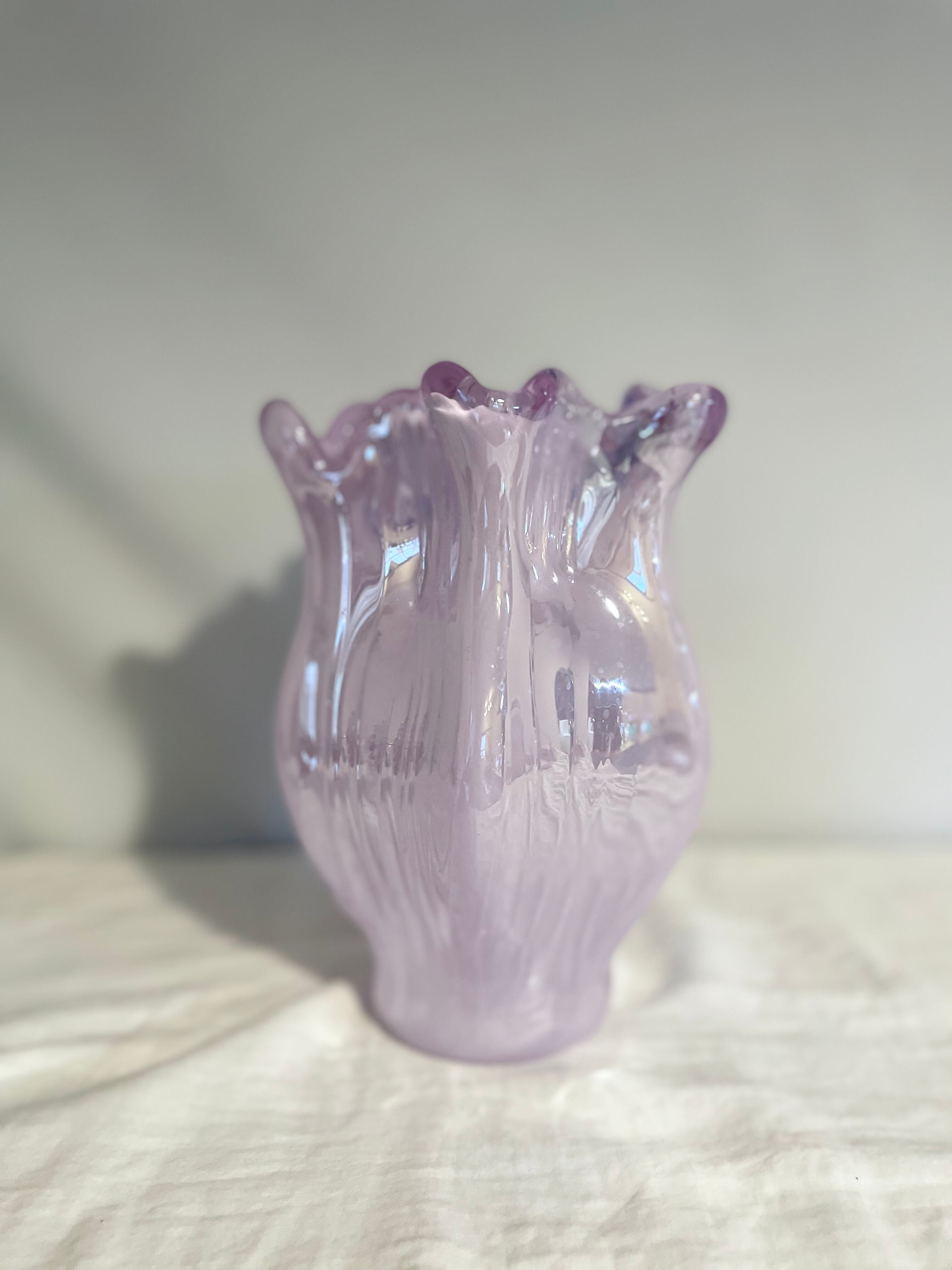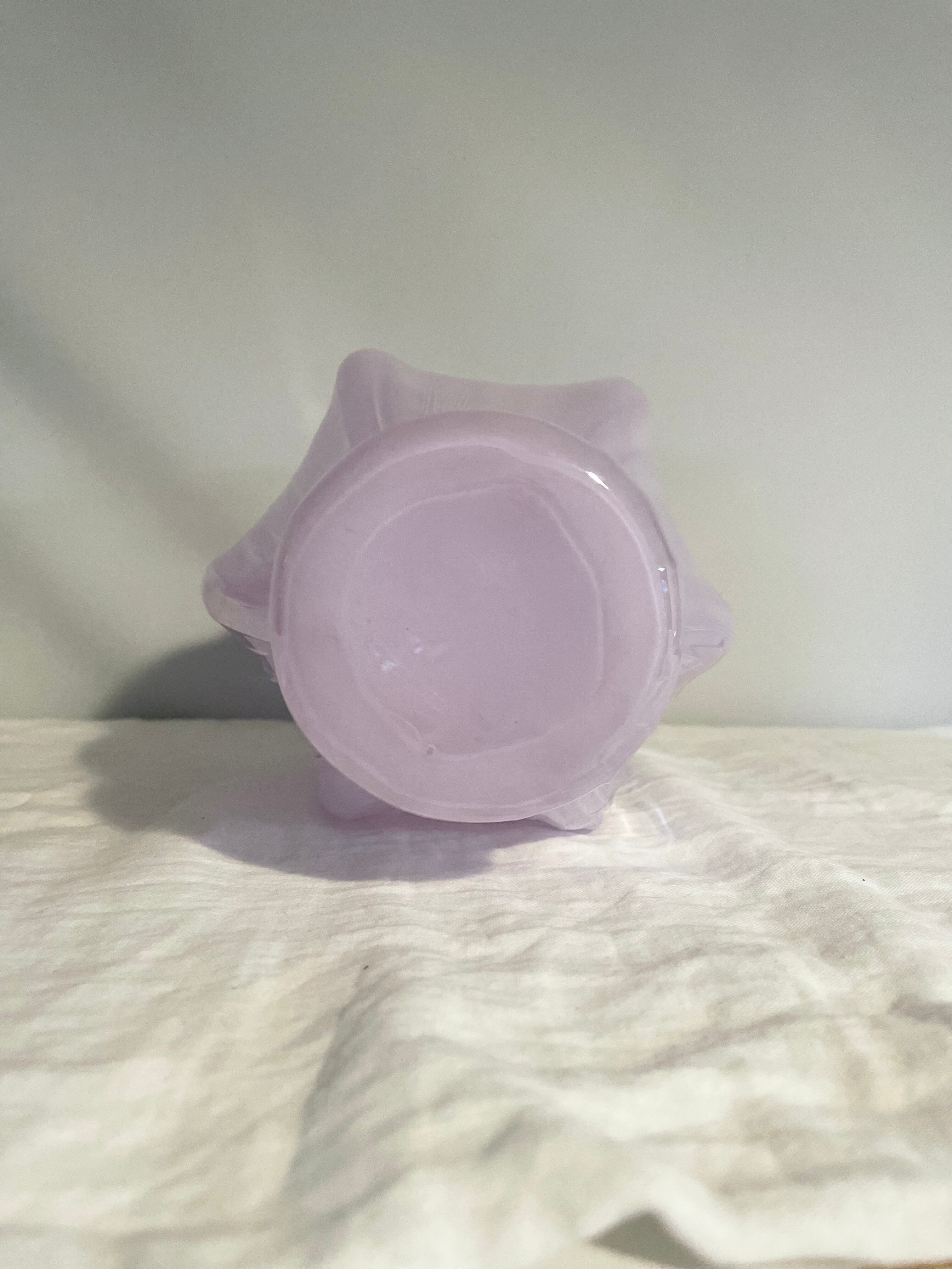 薄い紫色にうねりのあるデザインとパール感がとても可愛らしいヴィンテージのフラワーベースです。